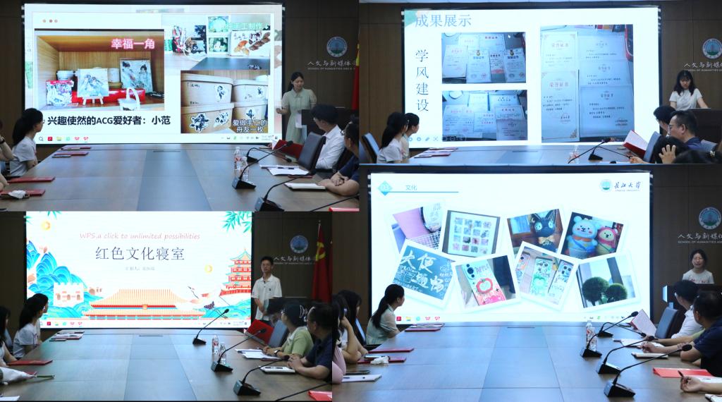 在寝室长交流环节,美好文化兰舍和党建先锋兰舍寝室表张恒瑞讲述以红色文化引领学习和生活;健康身心兰舍寝室长范紫诺分享寝室健康向上的生活方式;文明修养兰舍寝室长周梦琪交流室友兴趣爱好助推成长;优良学风兰舍寝室长卢陈晨展示学习魅力与学习效果。