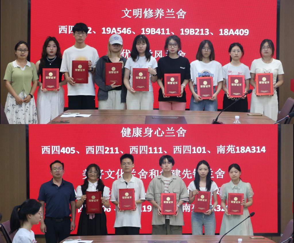 西4栋405等20个寝室被评为“健康身心兰舍”“党建先锋兰舍”“优良学风兰舍”“文明修养兰舍”“美好文化兰舍”等。竺正海和龚玉云为获奖寝室颁奖。