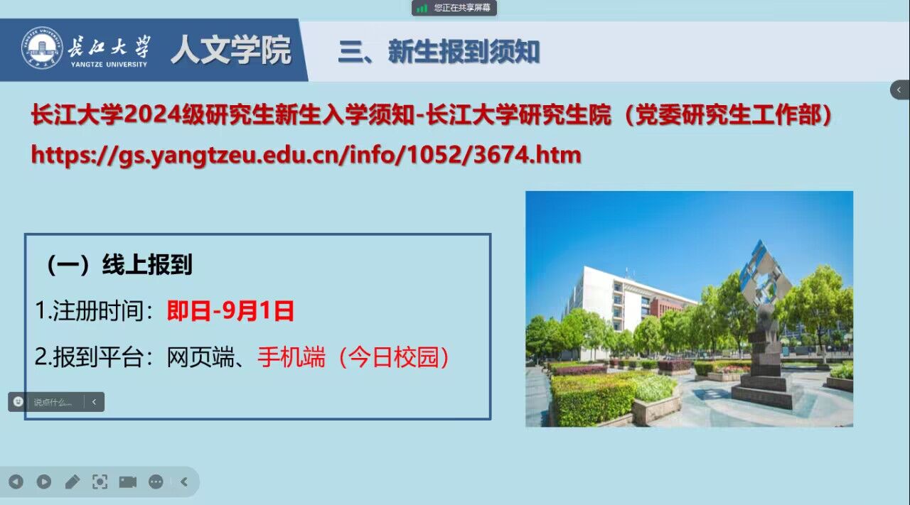 会议围绕开学时间、返校须知及新生报到须知展开。针对2022级、2023级研究生,陈娟老师强调同学们在平安返校的同时,也要及时调整学习状态,尽早做好职业规划,以饱满的热情投入到新学期的学习及工作中去。对于2024级研究生新生,陈娟老师重点讲解了线上注册及线下报到流程与注意事项,开展了消防、交通、人身、财产以及防诈骗、溺水、校园欺凌、毒品等安全教育,耐心解答同学们的相关疑惑。最后,陈娟老师强调,希望全体研究生在返校中注意旅途安全、做好个人防护;回校后及时与导师汇报,在导师的指引下科学规划学业、开启研究生阶段新征程;在后续的学习与生活中,面对困难,要主动与辅导员谈心交流,及时解决心理疑惑,以更好的状态投入到研究生阶段的学业中去。