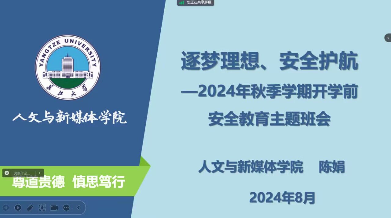 (通讯员 胡雅静)为保障学生安全有序返校,增强学生安全防范意识,引导学生尽快适应新学期生活,明确新学期目标和要求。8月22日,我院召开2024年秋季学期前安全教育主题班会,全体研究生参加会议,会议由研究生辅导员陈娟老师主持。