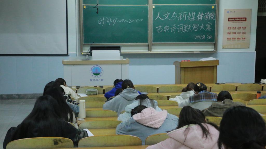 自去年10月份比赛通知发布以来,学生们积极准备、认真背诵,班级学习委员定期提醒督促,营造了浓厚的古典诗词学习氛围。比赛现场,赛卷铺展如长卷,参赛学生含英咀华,以墨痕为舟楫溯游诗河,或凝眉推敲“疏影横斜水清浅”的平仄,或疾书“戎马关山北,凭轩涕泗流”的顿挫,展现出人文学子良好的精神面貌。