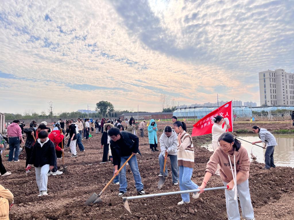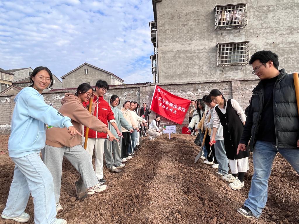 心向陶渊明“晨兴理荒秽”的田园意趣,同学们手持农具,踏着松软的土壤,协作的身影间,也拉近了彼此的距离——有人扶锹翻土时分享自己的劳作技巧,有人举镜记录,捕捉到泥土沾衣的鲜活瞬间,人文的底蕴与新媒体的表达,在田垄间完成了第一次和谐共振。
