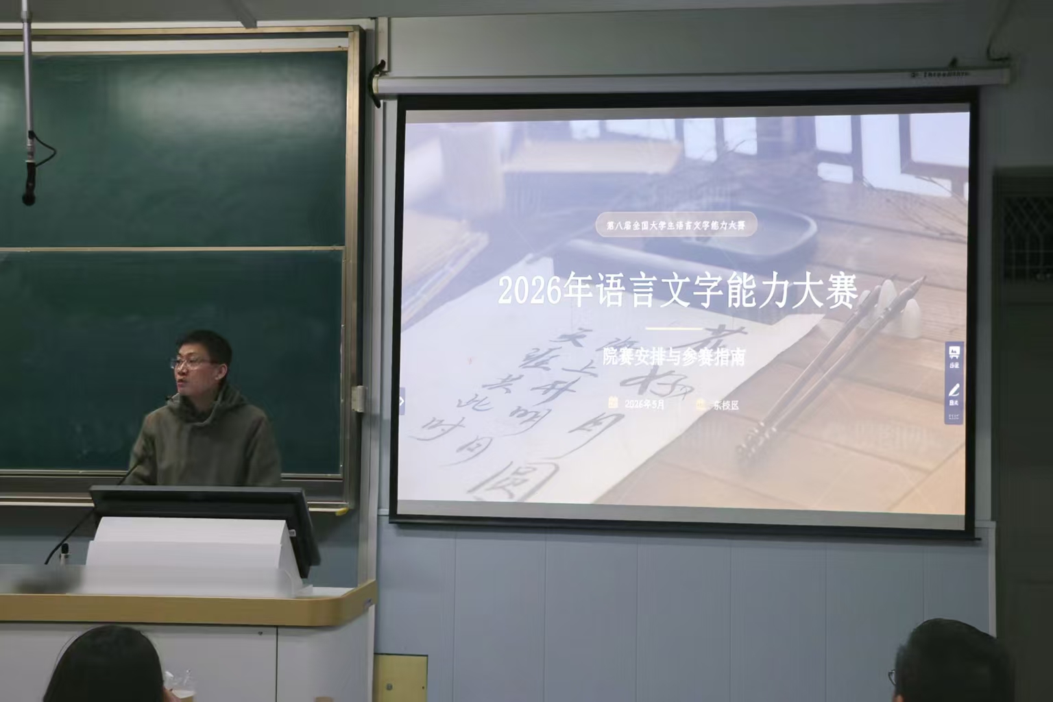 宣讲会由辅导员耿传令主持并开场动员。核心指导教师依次开展赛事宣讲,精准覆盖不同专业方向:李征宇副院长聚焦2026年语言文字能力大赛,明确备赛核心方向;章芳老师深度解析“田家炳杯”师范生教学技能竞赛,拆解教案设计、课堂展示等关键环节;纪希老师围绕米兰设计周等创意赛事,传授创意策划与实践技巧;徐思雨老师详解中国大学生计算机设计大赛的作品创作流程,推动人文与数字技术融合;王薇薇老师针对湖北省大学生新闻传播竞赛,指导新闻选题与内容创作;耿传令老师对第八届中华经典诵写讲大赛进行宣讲,引导学子厚植人文底蕴。