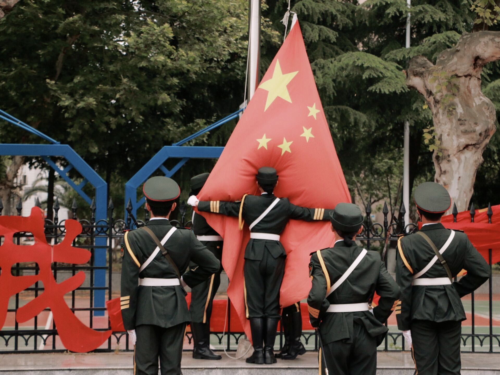 晨光熹微,仪式启幕。国旗护卫队迈着铿锵有力的步伐护送国旗入场,雄壮的《义勇军进行曲》响彻校园,五星红旗冉冉升起,全体师生肃立注目,神情庄重,彰显新时代人文学子昂扬向上的精神风貌。