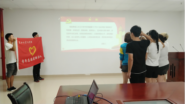 动员大会上,李博老师宣读了文学院2018暑期“三下乡”社会实践团队名单。文学院青年志愿者支队队长、社会实践团队长孙桥强调了本次社会实践的活动内容和预期目标,对各个成员的职责、分工进行了细致的说明,然后带领全体成员进行宣誓,面对鲜红的旗帜,立下坚定的誓言。