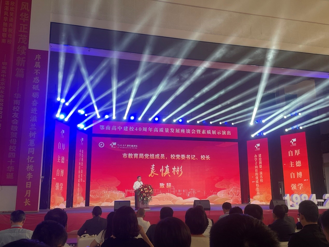 10月4日上午,在北大、华科大、武大等知名高校的贺信和校长、校友的祝福中,鄂南高中建校四十周年高质量发展座谈会暨素质展示演出开始。鄂南高中校长、各高校领导代表、中学校长代表、校友代表及咸宁市领导依次上台发言致辞。校友与鄂南高中师生联袂表演精彩节目,展示了学校素质教育的丰硕成果。