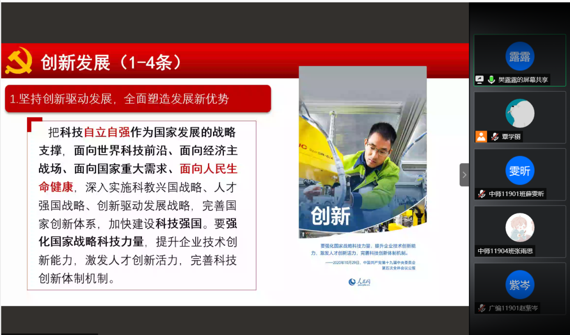 为深入学习贯彻党的十九届五中全会精神,进一步提高入党积极分子的思想政治素质,深化对党的认识,12月30日晚七点,yl6776永利集团全体入党积极分子开展腾讯会议集中学习党的十九届五中全会精神。本次会议由陈娟老师主持,新闻系教师樊露露担任会议主讲人。