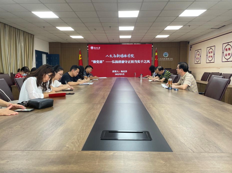 为进一步筑牢拒腐防变思想防线,擦亮廉洁自律思想底色,进一步落实“一下三民”实践活动要求。9月15日下午,学院党委书记杨克非在所联系的新闻历史行政联合教工党支部主题党日活动上讲授党风廉政教育专题党课。