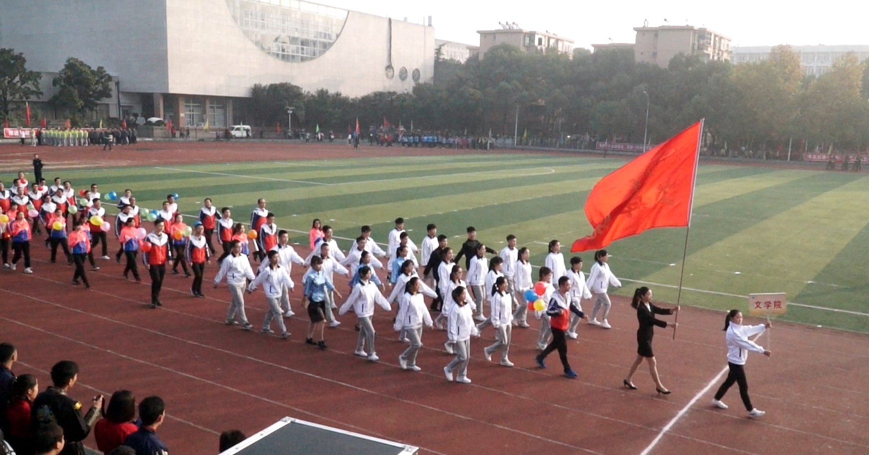 在入场式上,身着统一服装、喊着响亮口号、迈着矫健步伐的40余名老师和学生运动员方阵一起走过主席台,充分展示了文学院团结和谐、健康向上的良好精神风貌。在之后的第九套广播体操表演中,雒仁启、向会斌、严实、罗威、陈先蕾等10名老师与30名学生组成的文学院代表队跟着广播口令,齐刷刷地转身、下蹲、跳跃,步伐整齐,动作有力。