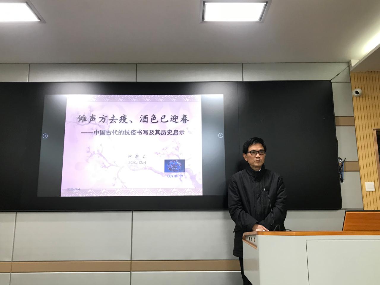 讲座开始,何新文教授由不久前疫情时期的亲身经历引出此次讲座的主题——中国抗疫,解释了主题中的诗句——“傩声方去疫,酒色已迎春”。随后,何新文教授用完整的数据给大家展示当前全球新冠病毒的感染情况,并阐释疫情对世界的重大影响。接下来,他从四个方面探讨了中国古代抗疫:古代疾疫的历史记载、古代人民的抗疫策略、古代文学的抗疫书写、古代抗疫的历史启示。首先,他解释“疫”字的内涵,分析《汉书》《后汉书》《三国志》《明史》《清史稿》等古书中有关疾疫的记载,展示了中国古代的疾疫情况。其次,他概括了中国古代主要的抗疫策略,即政府体制与中医中药防治、中医中药以外其他防治方法、采取一定程度的隔离措施、国家举行大傩祭祀逐疫禳灾、朝廷或官府的救助振困,同时引用大量古籍材料逐条进行解说。接着,何新文教授指出中国古代的抗疫文学主要是诗文词赋和小说,并列举各个朝代相关文学作品加以分析。最后,他总结了三条古代抗疫的历史启示:重视疫情生命至上的民族精神和人文情怀;发挥中医中药的重要作用;记载疫情、书写抗疫的诗学传统。