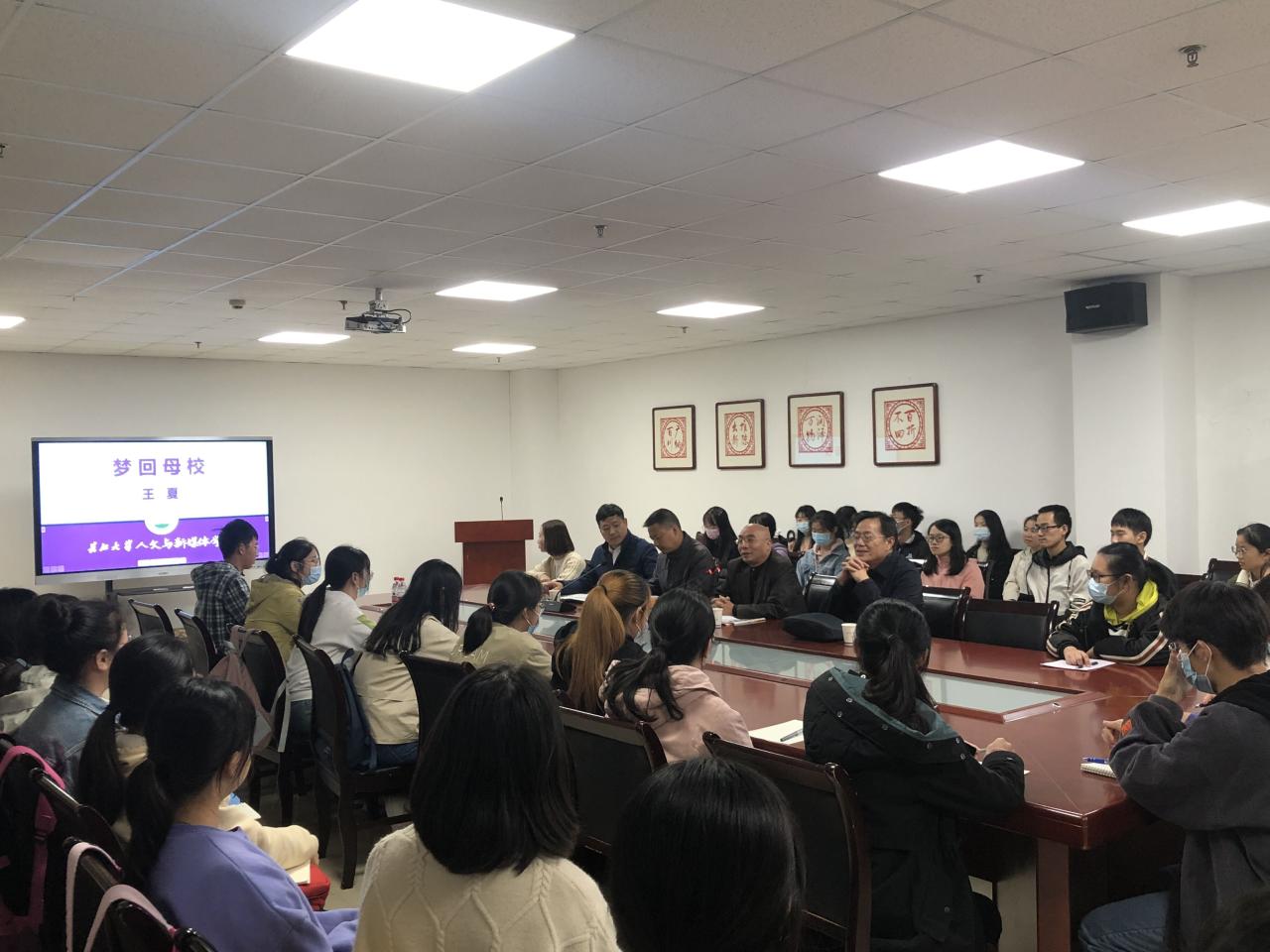 会议伊始,学院党委副书记胡世先向全体参会成员隆重介绍王夏学长并表示热烈欢迎。随后,王夏学长从理想主义,人文主义,实用主义三个方面,讲述自己的人生经历。从松花江到呼伦贝尔大草原,从黄河到长江,讲述了自己人生的创作和情怀。从怀揣着五百元下海闯深圳,到担任《中国作家》杂志社副社长并创立“鄂尔多斯”中国作家文学奖。并且该奖项在文学界,乃至海内外已具有一定的影响力和权威性。自己对于文学梦想的追求和人文情怀的追求始终是他坚持的动力,对同学给予厚望和鼓励。