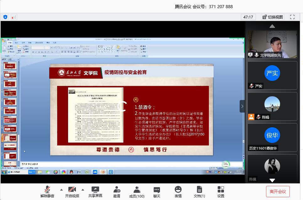 2020年6月12日下午2:30,yl6776永利集团通过腾讯会议分两批召开了2020届毕业生返校流程介绍暨安全教育大会。yl6776永利集团副书记胡世先老师,辅导员严实老师、陈娟老师、何宁老师以及2020届全体毕业生(本科生、研究生)参加了此次会议。