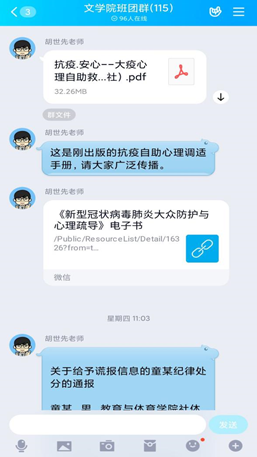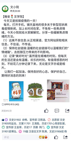 近期,我院召开网络班主任会议,动员全体班主任对疫情期间的学生状况进行逐一摸排、逐一筛查,详细了解学生当前所在位置,每日身体状况,落实每日报告制度。中文11701、中文11702等班级主动成立了疫情防控工作小组,学生党员、班干部充分发挥模范带头作用,采用“承包责任制”,主动联系班级骨干,确保及时准确地将相关通知和要求传递给每一位同学,提醒同学们在家做好自我防护,不传谣、不信谣,不提前返校。为了确保疫情防控工作全面覆盖到每位同学,文学院各年级以班级为单位召开“疫情防控 从我做起——我为疫情做贡献”的网络主题班会,院领导、班主任通过雨课堂、QQ群直播、微信视频通话等各种方式在线与学生交流,从疫情认知到自我防护,从宣传学校通知公告到抗击疫情倡议,从遵守防控职责到积极调整心态,帮助学生增强责任意识和防护意识,并重点强调了防控期间的纪律要求:所有学生一律不得提前返校,不得谎报、瞒报个人位置、健康信息等,声明了学校“联防联控、群防群控、严防严控、追责问责”的防控总要求。 推迟开学不停学,学院要求学生做好网络上课的一切准备,打印课表、定好闹钟,端正学风,保质保量开展学习。