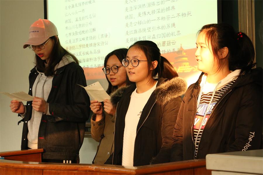 中文(文案)11601 团支部的杨天慈、石志雄和李丹同学带来的别开生面的情景剧。情景剧以 “新”为主题,结合十九的主题“不忘初心,牢记使命”,为我们展现新时代的诈骗手段,生动有趣,将气氛推向高潮。最后,李奎、李诗雨、方言、吕景伟为大家带来《我爱祖国》的诗歌朗诵,情感充沛,跌宕起伏,表达了对祖国深深的热爱之情。班主任杨家海老师对同学们提出三点寄语:为自己增才干,为家庭增福利,为母校增光彩。