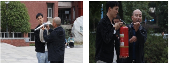 随后,保卫处工作人员向同学们演示了消防水带、灭火器的使用技巧,并现场模拟起火点,组织大家进行实操火灾模拟扑救。同学们踊跃参与,轮流操作灭火器体验了灭火过程。