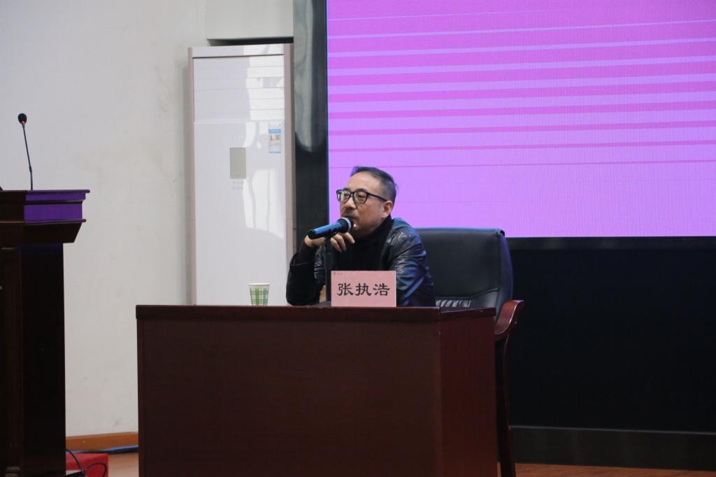 张执浩以“留得残荷听雨声——从诗歌在这个时代的命运谈起”为题,与同学们探讨诗歌的文化。他通过讲述自己历史专业出身,与李白、杜甫一样身上背负着种种生活的不堪,透彻地分析了写作的目的是人生的大失败和大撤退,告诉同学们为什么活的道理。张执浩结合自己的亲身经历,表达了他作为一个诗歌创作者行走在路上不眠不休只为寻找一位旷世知音的真诚,并以此告诫同学们诗歌创作不要虚情假意。然后张执浩抛出一个问题:网络时代人们为何很难理解古人的情感。他通过佛教中的“转世”鞭辟入里地解释了诗歌是一个活的变体,要随着社会语境的变化而变化。