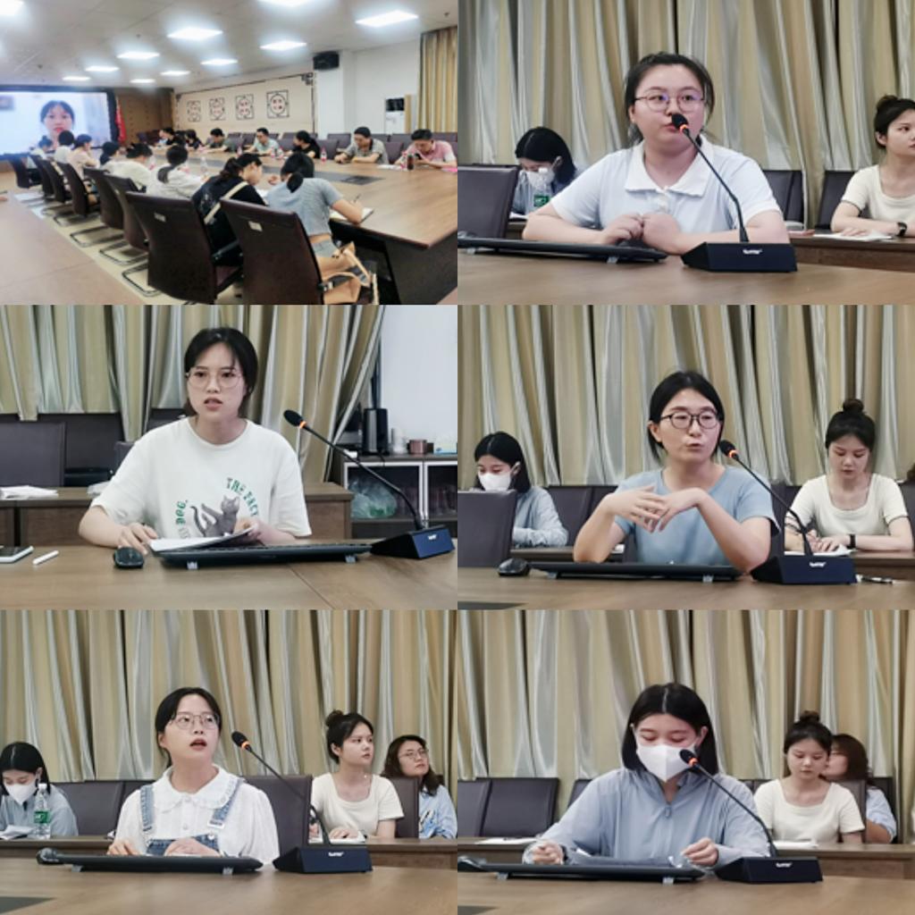 会上,校外实习小组代表何力同学从四个教育“热点”出发,以教学过程、《义务教育课程方案和课程标准(2022年版)》以及正面教育理论等与教育教学改革相关内容的论述拉开了会议的序幕。她利用具体的教学事例解释并分享了当前热门的理论研究,逻辑鲜明,理论性和实用性强。其余各实习学校小组代表蔡钰(荆州市东方红中学实习小组)、罗晓婧(荆州市江陵中学实习小组)、李文玉(湖北省沙市中学实习小组)、付淑芬(湖北省沙市中学实习小组)、黄静雨(湖北省荆州中学实习小组)等5名同学结合实习环境,以生动形象的图文结合形式从实习学校特点、实习心得和学科教学改革现状三方面讲述了实习感悟,有的还对学院实习工作提出了一些建议。