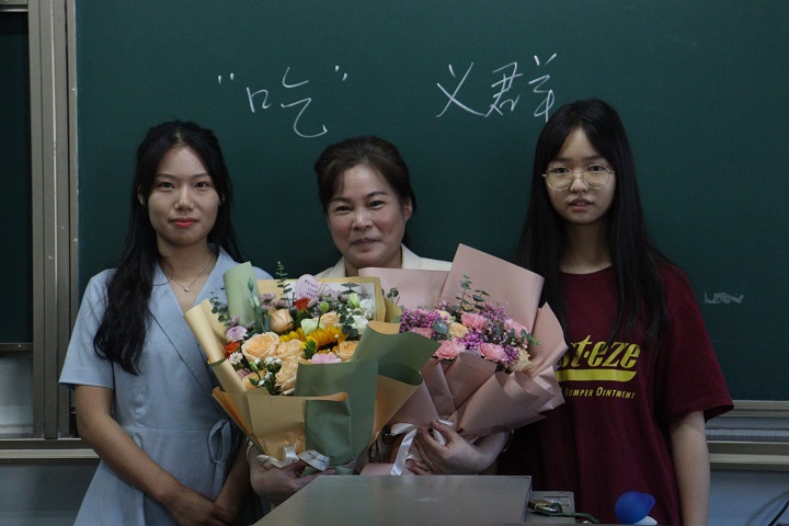 教师代表陈红莲、秦鹏举两位老师深情回忆了与周老师并肩教书育人的点点滴滴,对周老师在工作、生活中的帮助与支持表示感谢。吴桂美老师代表学院工会向周老师献上鲜花,学生代表也纷纷献上鲜花表达敬意和祝福。