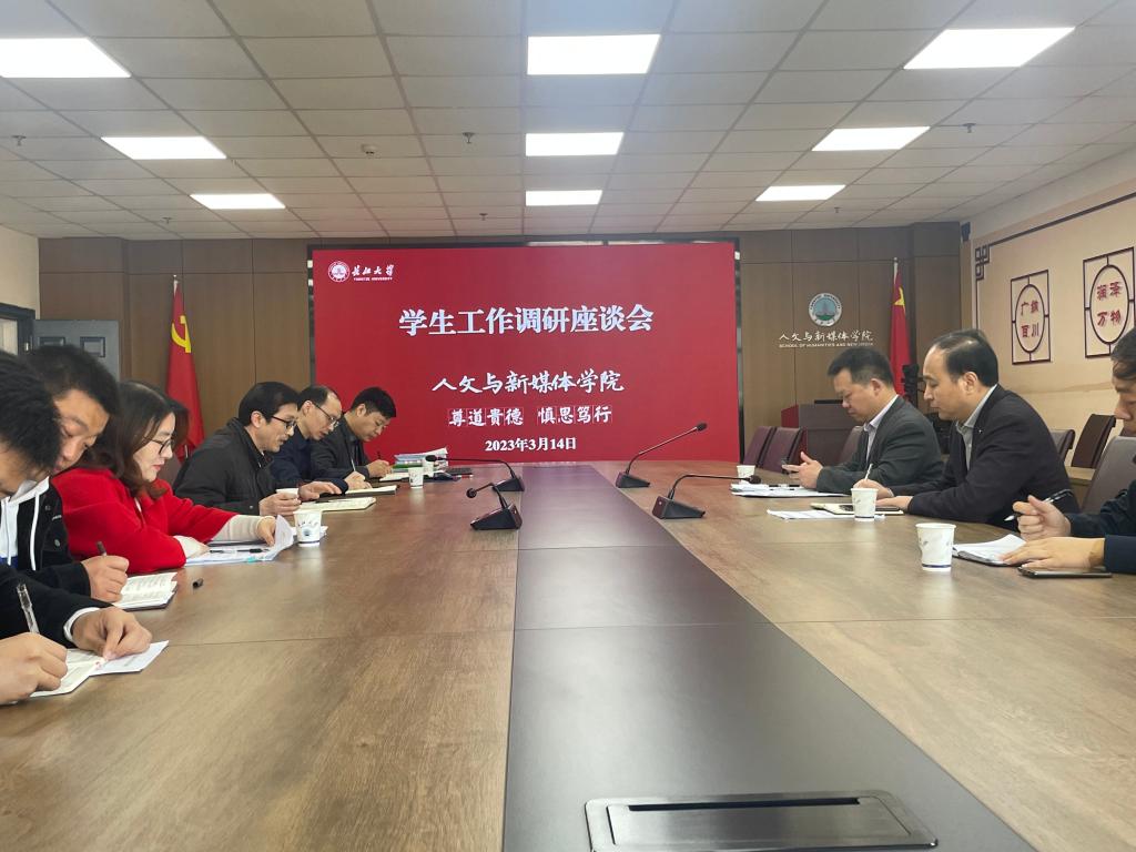 3月14日,校党委副书记、副校长杜国锋带领学生工作处副处长谢作喜、校团委副书记王宁到我院开展学生工作专题调研。学院党委书记杨克非、党委副书记胡世先、行政副院长程宏伟及全体辅导员参加调研座谈会。