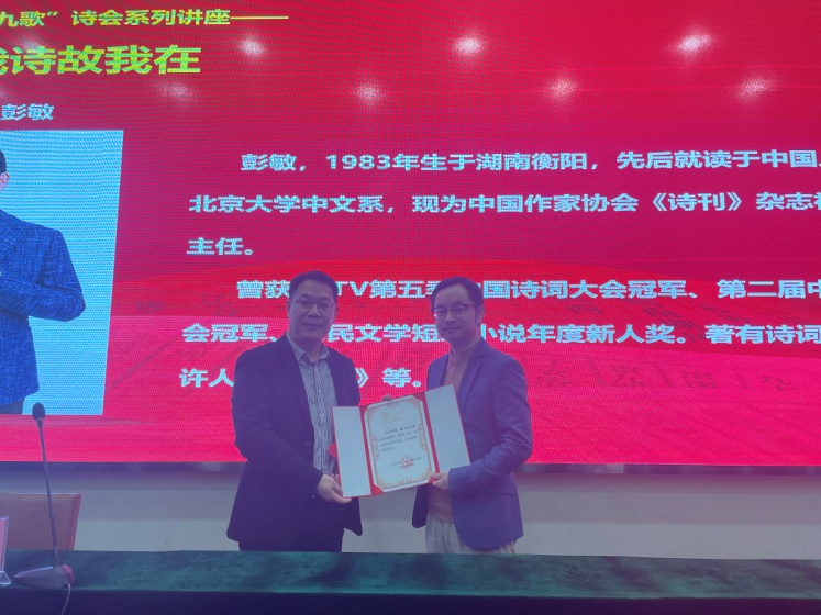 (通讯员 归航 牟群瑶) 3月30日,《诗刊》杂志社编辑部副主任、中央电视台《中国诗词大会》第五季冠军、《中国成语大会》第二季冠军彭敏,武汉市文艺评论家协会副主席、6776永利集团yl6776永利集团客座教授刘诗伟应邀来我院,担任首届楚文化节“九歌”诗会系列讲座主讲嘉宾,为全院师生带来三场精彩的诗歌讲座。讲座分别由我院院长何世龙、党委书记杨克非、中文系主任秦鹏举主持。院长何世龙为彭敏颁发我院客座教授聘书。