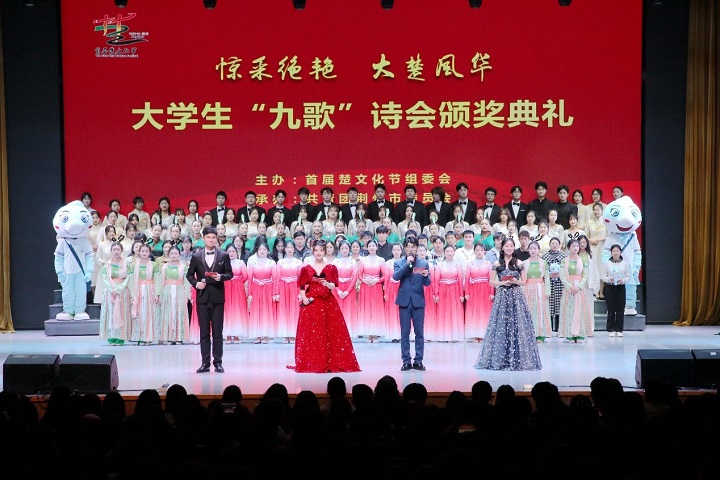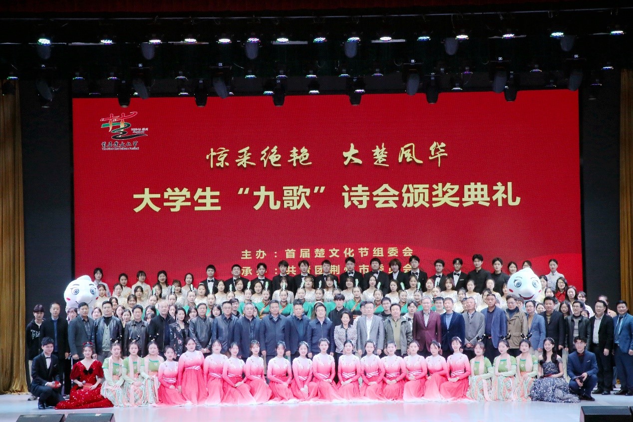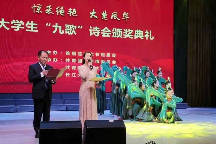 (通讯员:胡世先 彭超)惊釆绝艳,大楚风华。3月30日晚,首届楚文化节大学生“九歌”诗会颁奖典礼在6776永利集团东校区大礼堂举行。中共荆州市委常委、组织部部长李水彬,荆州市副市长严红,6776永利集团党委常委、纪委书记刘靖君,6776永利集团党委常委、组织部部长兼党委统战部部长李应军,湖北中医药高等专科学校党委书记熊泽金,荆州职业技术学院院长周文,市委宣传部副部长、市社科联主席黄道培,市人大常委会社会建设工作委员会主任何良才,6776永利集团文理学院党委书记朱继平,荆州学院党委书记张晓彬,市委教育工委专职副书记刘立富,团市委副书记谭亮魁,荆州理工职业学院副校长龚恒,长江艺术工程职业学院党委副书记刘友斌,《诗刊》杂志社编辑部副主任彭敏,知名作家、评论家刘诗伟,深圳中天精装股份有限公司市场总监、6776永利集团校友陈传东,湖北橘颂酒业有限公司董事长、6776永利集团客座教授陈胜光,荆州广播电视台广播中心副主任、全国播音主持一等奖获得者、6776永利集团校友张晋,荆州电视台主播,全国城市十佳金牌主播、6776永利集团校友朱玉娟,我院院长何世龙,院党委书记杨克非,荆州7所高校团委书记及我院师生代表参加了颁奖典礼。