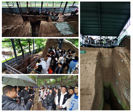 该遗址考古领队田勇在遗址现场为我系师生进行讲解。历史2021级同学认真聆听,并不时询问关于地层学、类型学知识的运用。田勇领队以生动形象的比喻,深入浅出地回答了同学们提出的各种问题。同学们还在现场分享了自己的考察收获。同时,历史系教师们还就不同地层信息、古城考古与文献、五代时期荆州历史等话题与田勇领队进行深入交流和讨论。