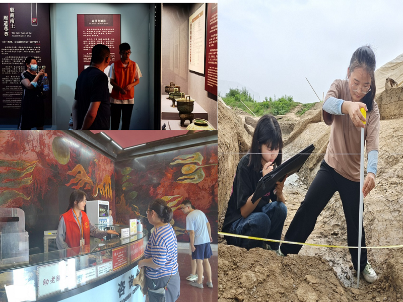 在荆州博物馆专业老师指导下,学员们分成三个小组,围绕荆楚文物展陈与讲解、陶器文物修复、考古实践等方面进行研学。文物讲解小组对《吉金耀彩——荆州出土铜器展》、《楚玉撷英——荆州出土玉器展》、《书于竹木——荆州出土简牍展》等5个陈列进行讲解,累计服务游客超2万人次;文物修复小组则通过观察陶片的厚薄、花纹、颜色及形状等对陶器进行修复,同时制作拓片,将青铜器等文物的形状及其上面的文字、图案拓下来;文物考古小组则前往秦家咀墓地组与郢城遗址,进行尺寸测量及考古绘图,参与考古发掘的现场工作。