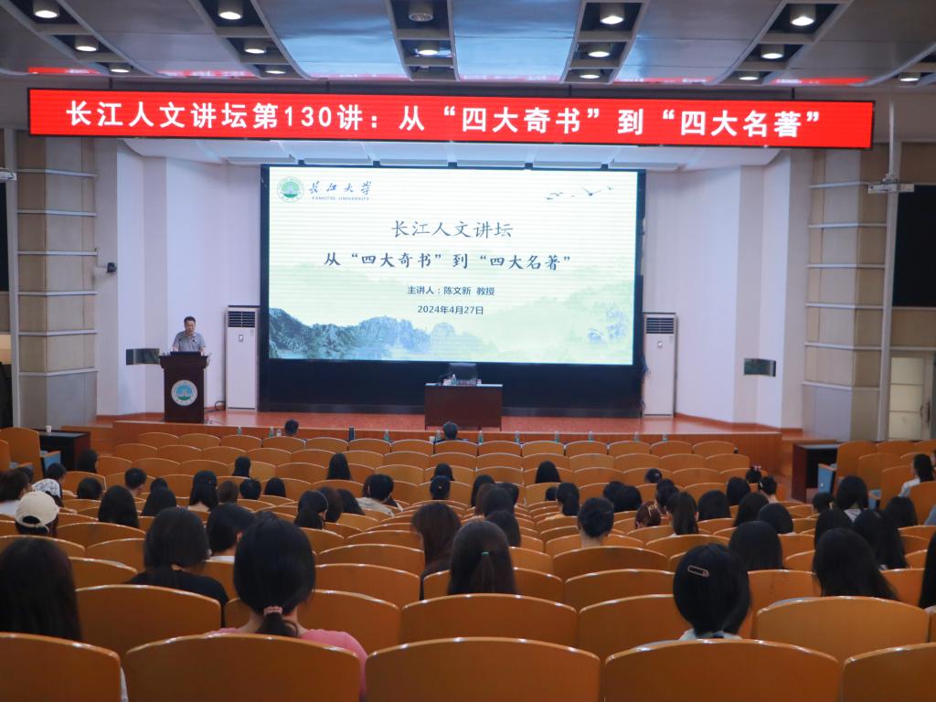 (通讯员 邱雨霏)4月27日下午,我院在12教405报告厅顺利举行长江人文讲坛第130讲。本次人文讲坛,特邀教育部重点编写教材《中国古代文学史》首席专家,武汉大学陈文新教授作题为《从“四大奇书”到“四大名著”》的讲座。本次讲座由yl6776永利集团院长何世龙主持,教师和学生共计200余人参加。