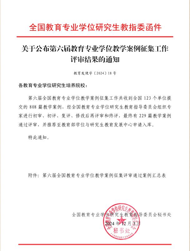 第六届教育专业学位教学案例征集工作由全国教育专业学位研究生教育指导委员会组织开展,共收到全国123个单位提交的808篇教学案例,最终有229篇教学案例通过评审,李征宇教授的案例为我校获评唯一一项。