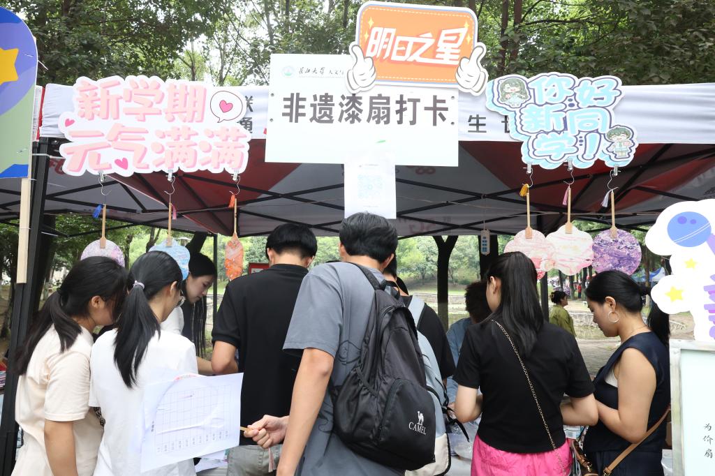 在迎新现场,除了常规的报到登记、行李搬运、校园指引等服务外,学院精心打造的“非遗漆扇制作体验打卡区”成为最受欢迎的亮点环节,新生与家长沉浸式感受非遗漆扇文化的独特魅力。