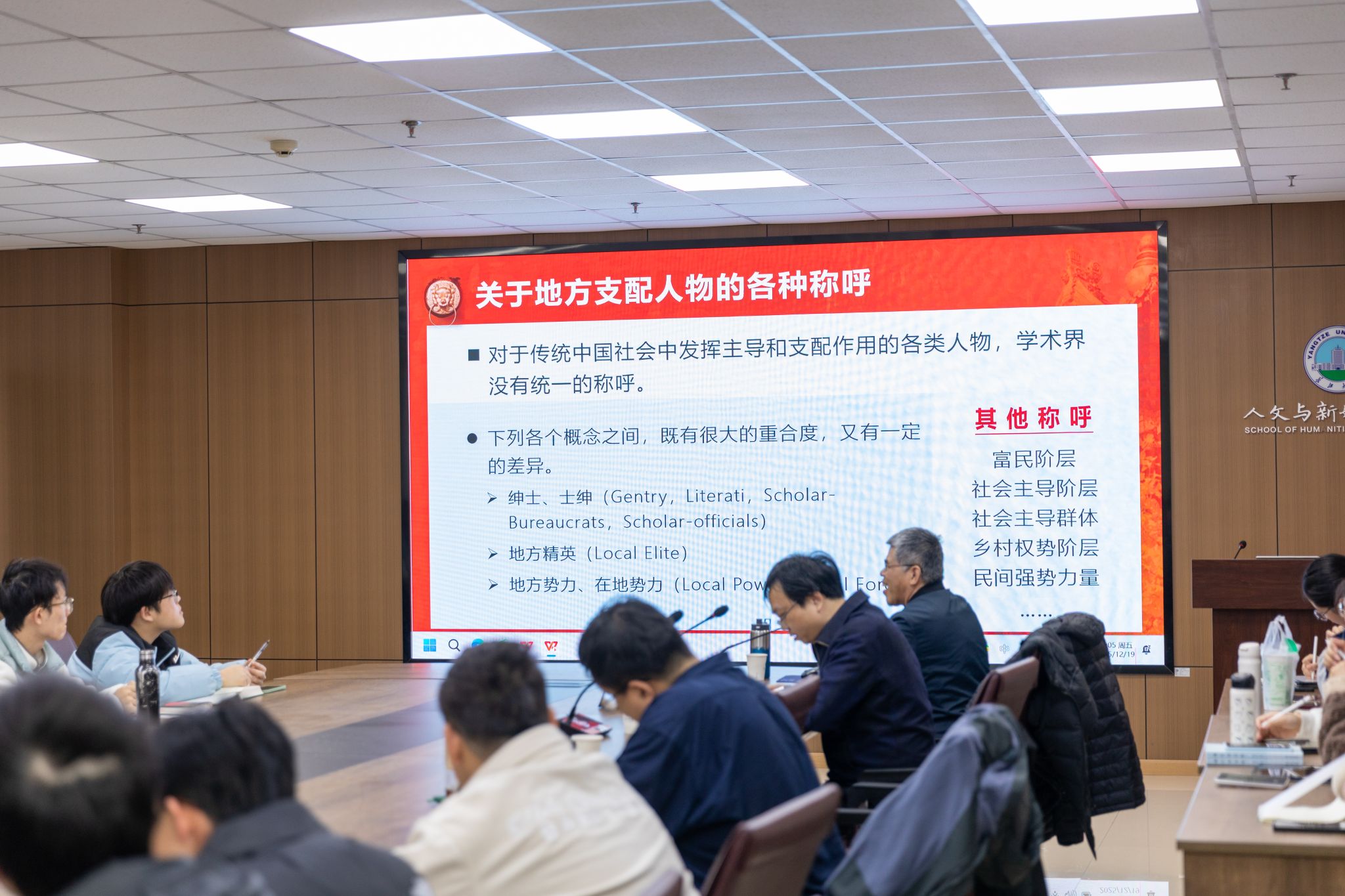 高寿仙教授以“从职役到士绅:明代地方势力的嬗变”为题,围绕明代地方权力结构演变展开深度解析,为现场师生呈现了清晰的历史脉络。报告中,高寿仙教授指出,明初朱元璋推行里甲制度,核心旨在规范地方权力结构,构建以安分守法的地主富民为核心的乡村治理秩序,实现对基层社会的有效管控。这一制度设计以“一百十户为一里”的编制为基础,通过里长、甲首等职役性精英承担赋役征收、治安维护等职能,试图打造人口与土地紧密结合的封闭性乡村社区,是明初治国方略的重要组成部分。但这一理想化设计难以持久。明代中后期,受人口流动、贫富分化、商品经济冲击等因素影响,原有乡村结构瓦解,以粮长、里长为代表的职役性精英地位骤降,治理模式失效。在此背景下,乡村权力逐步转移至士绅群体。高教授阐释,士绅凭借科举功名、经济特权及文化影响力,成为连接皇权与民间的关键纽带,承接教化、纠纷调解等核心职能,填补权力真空。这一嬗变是明代社会经济变迁与治理需求共同作用的结果,是明代社会整体变迁的重要维度。