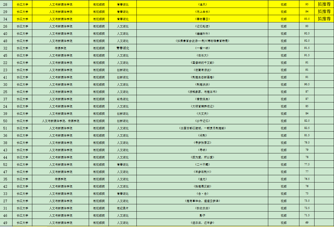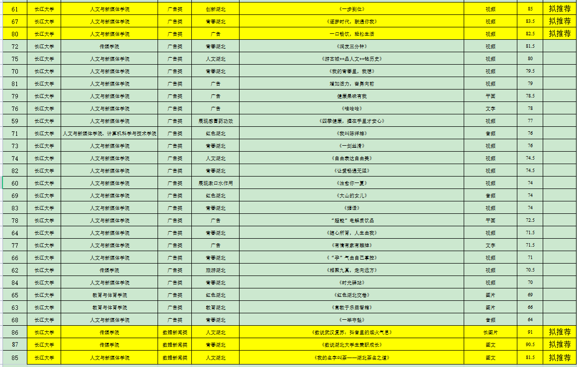 6月21日至25日,经yl6776永利集团与传媒学院商定,邀请两个学院未指导本次比赛作品的教师以及荆州广播电视台相关业内专家共计8人组织评审组,独立评审打分,综合成绩后计算平均分,从高到低进行排序,根据2023年度湖北省大学生新闻传播教育创新实践技能竞赛方案要求,每校每类别推荐不超过3项。现将结果公示如下: